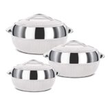 - Complete Set – Color: White; Material: Inner Steel; Outer Plastic; Package Content: 3 – Piece Inner Steel Casserole (450ml, 830ml, 1370ml) for serving a variety of dishes at home, parties, or family gatherings.